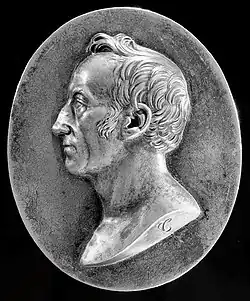 Tiolier was appointed controller of coins at the Paris Mint on 24 Frimaire year IV (14 December 1795). He was named Engraver-General of France by Napoleon, the First Consul, on 11 Germinal year XI (1 April 1803).[1] In 1816 he resigned his position in favor of his son, Nicolas-Pierre Tiolier (1784–1853).[2] In 1817 he was commissioned by the scientist James Smithson to make a bust medallion, which showed Smithson in profile.[3] Pierre-Joseph Tiolier died in 1819.[4]