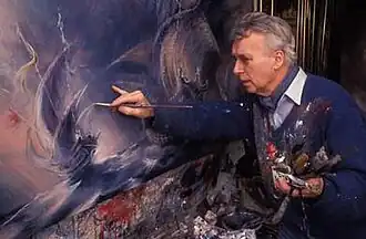 By his own admission,[6] Pierre Clayette was interested in scenography and theater design before even considering painting. The influence of Cassandre is evident in an artist who was one of the last representatives of the period between the 1920s and the late 1970s during which theater and opera directors often appeal to leading artists in the world of painting.[7] As such, Clayette is part of a lineage that included, among others, André Derain, Balthus, Christian Berard, George Wakhevich, Cassandre and André Masson. Clayette entered the world of scenography in 1955 for a ballet by Daniel Wayenberg with Pierre Lacotte who entrusted him with his first set of sets. Clayette became famous among the great names of lyric and dramatic scenes, such as Maurice Béjart, Pierre Lacotte, Gabriel Dussurget, Maurice Escande and Jean Le Poulain, maintaining a long involvement with the latter until Poulain's death in 1988. Clayette's talent as a stage designer gave him the opportunity to express himself on the most prestigious stages, such as the Comédie-Française, the Palais Garnier and the International Festival of Lyric Art in Aix-en-Provence.[2]