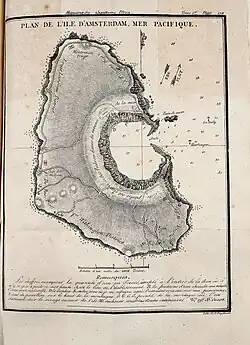 Captain Péron reports that he was marooned three years (from 1792 to 1795) on New Amsterdam Island or Île Amsterdam. He wrote an account about being marooned for 40 months gathering sealskins on that lonely Southern Indian Ocean island.[2][3] There was confusion in the early days between Amsterdam and Saint Paul Islands, and it is clear that the island is the one now known as Saint Paul.[1] In February 1793 Sir George Staunton was on his way to China on Lion as secretary to the Macartney embassy on the East Indiaman Hindostan. At Île Amsterdam they found a sealer named Perron and 4 others on the southern of the two islands, now called Saint Paul Island.