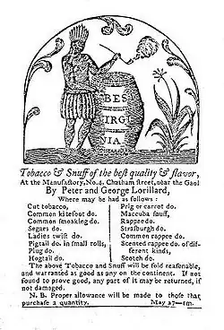 Lorillard's father, Pierre Abraham Lorillard (also known as 'Pierre Lorillard I'), was the founder of the Lorillard Tobacco Company.[2] Lorillard's father made the first American tobacco fortune by developing a tobacco firm that he started in 1760.[2] Originally the business was a snuff-grinding factory located in a rented house in lower Manhattan. It was called Lorillard's Snuff and Tobacco company and sometimes the name was abbreviated as J. Lorillard.[2] Later the firm moved to a better location on the Bronx River. Lorillard II took over and continued to manage and operate the family business after his father's death in 1776.