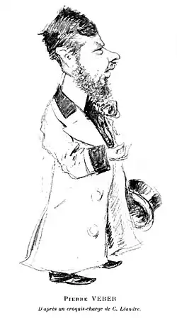 Little is known about his youth. He himself explained: "My studies were quite limited, of which I am not proud."[2] By 1889, his work had already been published in the literary periodical Gil Blas, as André Antoine says in his journal[3] entry from 25: "This evening, Rue Blanche, we are being visited by two newcomers, Tristan Bernard and Pierre Veber, two young journalists of great intellect who, each week, write for Gil Blas, a news magazine illustrated by Jean Veber." In 1892, Pierre Veber contributed to the magazine Le Chasseur de Chevelures (The Hunter of Locks), under the guidance of Tristan Bernard. This humorous newspaper had only two issues, in 1892 and 1893, and in the latter year Pierre Veber was credited as co-author in the statement: "Tristan Bernard: honest editor; Pierre Veber: corrupt editor."[4]