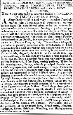 Thomas Forsyth (1743-1810) was a wealthy property owner. His main residence was in Upper Wimple Street, London and he also had a seat at Empingham Hall.[3] He built Pierremont Hall as a seaside holiday house. He married twice but had no children. His first wife was Elizabeth Neale (1743-1799) who was the daughter and coheiress of Fenn Neale. She died in 1799 and in 1801 he married Jane Martin (1756-1835). Shortly before he died in 1810 he sold the house. The advertisement for this sale is shown. The new owner was Thomas Watkinson Payler.