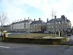 The Piershill Square East/West/Portobello Road tenements, containing 342 dwellings, were built 1937-8 by the Edinburgh Corporation Council. They were designed by Ebenezer James MacRae (1881–1951), Edinburgh's City Architect and members of his architectural team, Malcolm Murchison, James Tweedie and Andrew Rollo. MacRae was City Architect for twenty years and his infill developments and reinterpretation of Scots vernacular architecture are an important part of Edinburgh's inter-war heritage. These tenements reflect MacRae's tours of Europe in their planning and layout.[2] Many of the original multi-pane sash windows have been replaced with uPVC (without listed building consent) as the flats were sold under the right to buy. They were built on the site of Piershill Barracks, and re-used the stone facings from the old buildings.[3] They are a reinterpretation of the traditional tenement, a housing type more usually associated with the Nineteenth century.[4]
