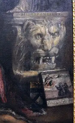 The painting is Titian's last, left unfinished at his death. An inscription in the lower part of the painting records that it was finished by Palma Giovane, whose interventions seem to have been kept to the minimum necessary, and doing his best to match Titian's own style.[1] A minimalist view of the areas he worked on is that it "was limited to the angel with the torch and to touching up the tympanum of the stone shrine",[2] but the statue of Saint Helena and Jerome's cloak have also been suspected of showing his hand, and he may have touched up the architecture more generally.[3]