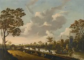 Some of his work is also similar to that of Pieter Casteels II, a Flemish painter known for his Italianizing landscapes and city views.[5] His paintings often include lively scenes such as village festivals and people having fun on the ice.[3] His paintings are lively and the brushwork is precise.[4] His palette is clear and soft and announces the 18th century.[3]