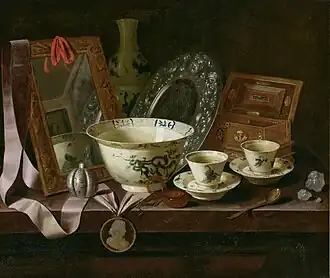 An example is the Vanitas still life at the Royal Collection Trust. It includes several objects that invoke the vanitas meaning: a skull, a glass orb and a pocket watch. The book is open at a print of a laughing Democritus inscribed in Latin with lines which can be translated as: 'Everyone is sick from birth / vanity is ruining the world'. In the suspended glass sphere in the composition can be seen the reflection of a room and the figure of an artist looking towards the viewer, probably a self-portrait. Self-portraits have been identified in at least nine of van Roestraten's still lifes.[5]