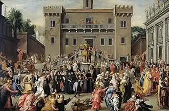 In 1593, he married Susanna Crayborn from Antwerp; the couple had several daughters and one son Isaack, whose baptism was witnessed by Joris Hoefnagel.[4] Pieter Isaacsz cooperated with Paul Vredeman de Vries a connoisseur of perspective, and Hendrick de Keyser. He became the teacher of Pieter Lastman,[5] and Adriaen van Nieulandt, according to Arnold Houbraken.[6] After the Kalmar War he was given his father's position (-1615) as an inspector general for the Sound toll in 1617-1625.[7] In 1619, however, he was criticized for not sending reports for two years.[1] In 1620 he was appointed in Swedish service of Gustav II Adolph or Axel Oxenstierna. Isaacsz was very well rewarded for his intelligence work. The payments were hidden away among the fees for the paintings he sent to Sweden. For five years he maintained this double life. Isaacsz wrote a total of 58 reports on everything from military building plans to visits by foreign diplomats, the Sont toll and much court gossip.[8]