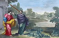 The first Pieter Mortier (Leiden, 1661 – Amsterdam, 1711) was the son of a political refugee from France, and became a mapmaker and engraver. He travelled to Paris in 1681–1685, then returned to Amsterdam where he operated as a bookseller from 1685 until 1711. He won the privilege in 1690 of publishing maps and atlases by French publishers in Amsterdam for the Dutch market.[1] He used this privilege to win a similar set of privileges for printing an "illustrated print bible" in 1700.[1] Also known as "Mortier's Bible" (Dutch: Mortierbijbel or Prentbijbel Mortier), this book's official name was Historie des Ouden en Nieuwen Testaments, verrykt met meer dan vierhonderd printverbeeldingen in koper gesneeden ("History of the Old and New Testaments: enriched with more than four hundred printed illustrations cut in copper"). The text was written by David Martin (a French Protestant theologian in exile), while the engravings were made by several artists who were well known at the time, including Bernard Picart, Jan Luyken and Gerard Hoet.[2] According to Houbraken, David van der Plas worked with Pieter Mortier I on etchings for Bybelsche Tafereelen (Bible stories), published in Amsterdam in 1700.[3][4][5]