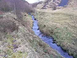Rag Hole Brook, whose name derives from the Lancashire dialect word "rag", meaning hoar frost,[17] enters Ogden Reservoir. Wickenhall Brook is the major lower tributary. Its source is in high moorland near the A640 Huddersfield Road, in Little Rochdale Parish. After passing beneath the road, it flows down a deep clough, feeds two former mill ponds, is culverted beneath the site of a former mill and print works, and is finally culverted at Lanebottom, before flowing down to join Piethorne Brook before Ogden Mill. An overflow drain arcs round to Ogden Reservoir. It falls 200 m (610 ft.) in a little over 2 km (1.3 miles).[18]