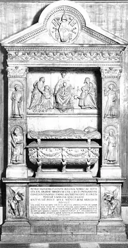 In 1473 he travelled to northern Italy to oversee the cession of Imola from Milan to the Republic of Florence. At his return to Rome, Riario died suddenly in his house at age 28.[4] It was suspected that he had been poisoned,[5] although an indigestion was also possible. He was buried in Santi Apostoli in a magnificent Renaissance tomb sculpted by Mino da Fiesole and Andrea Bregno. His role as Sixtus' collaborator was inherited by his cousin Giuliano della Rovere.
