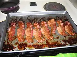 Pig candy is a dessert made by taking thick strips of smoked bacon and pecans and coating them in caramel or another type of sugar, notably brown sugar.[1][2][3] Cayenne pepper[4] can be added and it can be dipped in chocolate.[5] This dish is then served warm or cold and is popular in the southern United States,[6] and it has also become very popular in Washington D.C.[3] It is similar to glazed bacon, featured on Martha Stewart Living.[7]