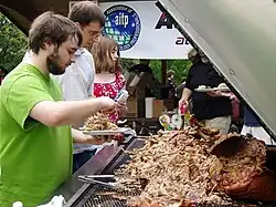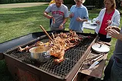 The pig pickin' is a significant part of the culture of the South; the necessary work and time needed to cook the hog makes it ideal for church gatherings ("dinner on the grounds") or family reunions, and they can be held virtually year-round thanks to the region's mild winters. Pig pickin's are popular among the most devoted tailgaters at college football games across the South. East Carolina University in Greenville North Carolina, famous for its football tailgating, has been holding an annual pig pickin' contest called the Pigskin Pig-Out since 1985.[8] The pig pickin' has been long associated with politics; many local political parties and politicians still use the pig pickin' to attract people to meetings and campaign rallies. In 1983, Rufus Edmisten, running for Governor of North Carolina at the time, was overheard saying "I've eaten enough barbecue. I am not going to eat any more. I'm taking my stand and that is it."[9]