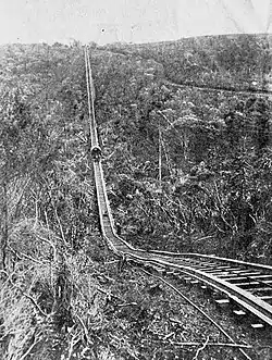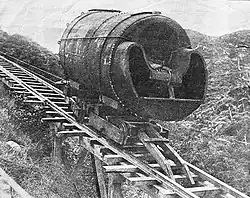 In December 1910, the incline was already one mile (1.6 km) long and supposedly the steepest railway line in the world at that time. On this part of the route, a rope had to be hung from the winch on the back of the wagon, before it went down the steep section, to reduce its downward speed.[3]