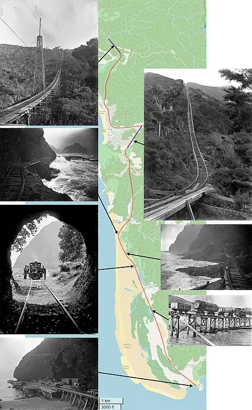 Before the railway was built, the wood was dragged by oxen or horses on the beach at low tide to Whatipu. Around 1906, Dr Raynor, a Canadian-born dentist working in Auckland, participated in William Stokes' timber extraction company, which had come into financial difficulties. Together they built a sawmill and a steam-powered forest railway. The wood was brought from the Piha Valley up to the steam-operated sawmill by a 1:4.5 (22%) steep incline and then to Karekare Beach by a 1:2.5 (40%) steep incline over a total distance of about 8 kilometres (5.0 miles).[1][2]