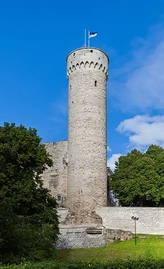 Pikk Hermann (Estonian lit. 'the Tall Hermann'; German: Langer Hermann) is a tower of the Toompea Castle, on Toompea (Domberg) hill in Tallinn (Reval), the capital of Estonia. The first part of the tower was built in 1360–1370. It was rebuilt (height brought to 45.6 metres (150 ft)) in the 16th century. A staircase with 215 steps now leads to the top of the tower. It consists of ten internal floors and a viewing platform at the top.