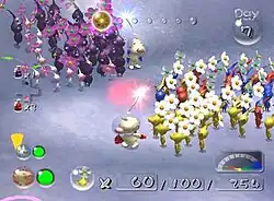 The Pikmin themselves come in five distinct colors, which indicates their strength or immunity to hazards. Red, Blue, and Yellow Pikmin, which originally appeared in Pikmin, are resilient to fire, drowning, and electric hazards, respectively. Two new colors, Purple and White, are unique to Pikmin 2. White Pikmin are swifter than the other types, can resist poisonous gases and poison enemies if devoured, and can locate hidden treasures buried in the soil. Purple Pikmin, while not immune to any hazards, are slower but far stronger than the others and can lift as much as 10 ordinary Pikmin. They are also heavy, and can stun enemies when thrown at them. Because of these characteristics, the player must choose the Pikmin that are best-suited to the task at hand.[4] The stalk on a Pikmin's head, topped with either a leaf, bud, or flower, indicates their swiftness and strength, growing upon consumption of nectar harvested from various sources. More Pikmin can be born by bringing pellets or enemy carcasses to the "Onion" motherships, where they can be safely stored and extracted. Purple and White Pikmin do not have their own Onions and are stored inside the Hocotate Ship, and are created by throwing existing Pikmin into rare flowers called Candypop Buds. The game also introduces a sixth Pikmin type, Bulbmin, which are resistant to all hazards but are only temporarily usable. Lastly, it introduces sprays that can be collected by harvesting certain plants. The purple spray can be sprayed on enemies, and causes them to temporarily be encased in stone, making them vulnerable to attacks. The red spray gives Pikmin a temporary boost to their speed and attack strength.
