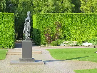 The Margaretapaviljongen (Margareta Pavilion) and the Blomstergatan (Flower Street) are a legacy of the Baltic Exhibition. They lie on the southern end of the park and consist of a small pavilion and a path leading to it, sidelined by flowers. Blomstergatan was originally designed by Crown Princess Margareta for the Baltic Exhibition, and it has been restored to its original design. The restoration included reconstructing the original brick walls, which store heat and improve the local climate for flowers. Issues such as poor irrigation and excessive pruning have also been addressed, enabling a vibrant display of flowers during spring and summer. A nearby building once housed the Margareta Restaurant, but it has closed and is in poor condition following a fire. As of March 1, 2024, Malmö City owns the building, and its future is under review.[3]