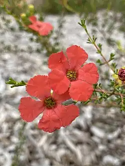 The upright and slender shrub typically grows to a height of 1 metre (3.3 ft). It blooms between September and November producing red flowers.[1] The woody shrub has prominent oil glands and lives between 5 and 10 years. The twiggy branchlets are covered in small hardy evergreen leaves.[2]
