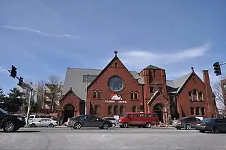 Pilgrim Congregational Church is a historic church building at 540-544 Columbia Road in the Dorchester neighborhood of Boston, Massachusetts. The brick Romanesque Revival building was built 1890–1893 to a design by Worcester architect Stephen C. Earle. The congregation for which it was built was established in 1862; this was its second purpose-built church. The congregation was divided when the Romsey Congregational Church was established in 1893 to serve congregants living closer to Savin Hill; the two congregations were reunited in 1930, and stained glass windows from the Romsey Church were installed in this building.[2]