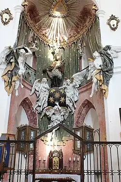 The main altar on eastern side is placed into high arcade. The peak of the altar reaches to the railing on the gallery on the second floor. Carvings of five angels on the main altar (with its count five pointing to John of Nepomuk) and the Four Evangelists are made by hands of a sculptor coming from Chrudim named Jan Pavel Čechpauer in years 1725–27. Three of five angels are bearing a sphere standing for heaven sky decorated with five stars. On the sphere stands figure of St. John of Nepomuk. The sculpture is a work of Řehoř Theny. He made also the reliefs on the litter for the silver pilgrimage statue of St. John of Nepomuk from year 1729 made by prague goldsmith Jan Diesbach. This statue disappeared after year 1784. The choice of contacting sculptors close to Matthias Braun was on purpose because Santini collaborated on his realizations many times actually with Braun whose 'sculpture language' was apparently very close to Santini's personality.