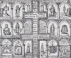 The showing of the relics must have been a theatrical event during which many pilgrims were overcome with emotion. Throughout the ceremony loud cries could be heard.[9] Some pilgrims were sitting on rooftops around Vrijthof to get a better view of the relics and to benefit from their exposure.[10] Many took bread, meat and personal objects with them in order to be blessed by the relics. The relics were shown in four groups. Each group was announced with a formula that started with: "Thou shall be shown...", followed by a brief description of the objects and a prayer. The fixed order was: 1. the sudarium of Saint Servatius (one of the three "heavenly cloths", lost during the Siege of Maastricht of 1579) along with his crozier; 2. the red shroud of Saint Servatius along with his pilgrim's staff; 3. the white cloth that covered the sarcophagus of Saint Servatius, along with his chalice and paten; 4. the reliquary bust of Saint Servatius, the reliquary arm of Saint Thomas and the silver pectoral cross made by Saint Luke for the Virgin Mary.[11] The pilgrims were then invited to visit the grave inside the church and see the other relics on display there.[notes 3] The ceremony was concluded by bell ringing and pilgrims blowing their pilgrim horns.[12]