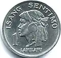Struck in aluminium, the 1 sentimo coin features a profile of Lapu-Lapu on the obverse and the coat of arms of the Philippines on the reverse.
