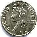 Struck in nickel-brass, the 10 sentimos coin features a profile of Francisco Baltazar on the obverse and the coat of arms of the Philippines on the reverse.