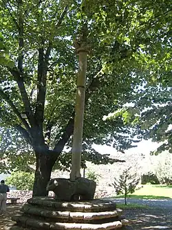 The Pillory of Bragança (Portuguese: Pelourinho de Bragança) is a 15th-century sculpted stone column with symbolic political, administrative and judicial significance, erected over a four-step octagonal platform, located in the civil parish of Sé, Santa Maria e Meixedo, municipality of Bragança. It consists of a cylindrical column erected over a square platform, sculpted with zoomorphic symbols, anthropomorphic scenes and the shield of the city of Bragança. Its structural design and sculptural ornamentation is characteristics of the era; the column is classified as a National Monument since 1910.[1]