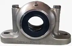 A plummer block usually refers to a heavy or very heavy duty housing, always in two pieces. The lower piece is bolted to the base plate or foundation, then the bearing and shaft are rested on it, and the cap is bolted down to the lower piece.[1] Plummer block bearings may be designed for more corrosive environments.[1]