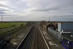The railway through Pilning has three tracks: from north to south these are the Up Tunnel towards Bristol; the Down Tunnel towards Wales; and then the Down Pilning Loop, also towards Wales. A fourth track, the Up Pilning Loop, ends just west of the station. All three tracks through the station are unidirectional. The two Tunnel lines have a 90 miles per hour (140 km/h) speed limit, while the loop has a speed limit of 40 miles per hour (64 km/h).[6] The line is electrified using overhead wires.[7] Despite there being three tracks, Pilning only has a single platform in use, Platform 1, on the north side of the line. This is 120 metres (130 yd) long and serves trains towards Bristol. The old down platform, Platform 2, sits between the Down Tunnel and Down Pilning Loop, but is no longer accessible to the public. It is 121 metres (132 yd) long.[6][8] There is an old brick station building on Platform 1 but it is not in railway use.[9] Infrastructure owner Network Rail has a compound at the station.[10]