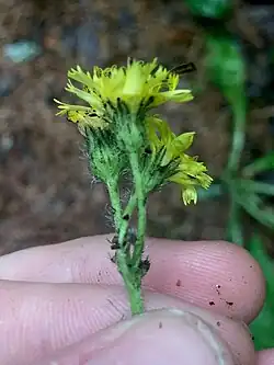 Pilosella flagellaris is a small herb up to 20 cm (7.9 in) tall, with leaves mostly in a rosette at the bottom. Leaves are up to 130 mm (5.1 in) long, with no teeth on the edges. One stalk will produce 2-4 flower heads in a flat-topped array. Each head has 90–120 yellow ray flowers but no disc flowers.[3]