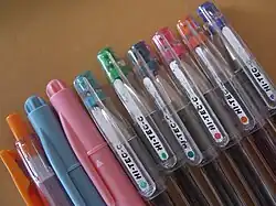 - ^ These pens have a mechanism for which their gel ink become transparent by erasing-friction heat; "When you rub the ink with the hard rubber eraser, heat from the resulting friction causes a temperature-sensing compound to activate an acid compounds, thus neutralizing the dye."