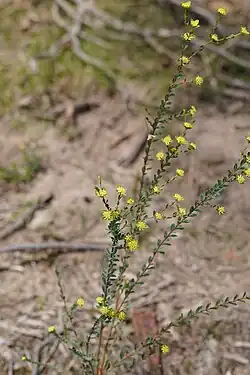 Diosma rice-flower (subsp. dichotoma) grows in sand or heavier soil, often in mallee shrubland and occurs from the Eyre Peninsula in South Australia to near West Wyalong in New South Wales and to the Grampians in Victoria.[10] Yellow rice-flower (subsp. flava) mainly grows in sandy soil and is found from the Yorke Peninsula in South Australia to East Gippsland in Victoria and from the south-east to the north of Tasmania.[15][20]