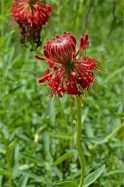Pimelea haematostachya, commonly known as pimelea poppy,[2] is a species of flowering plant in the family Thymelaeaceae and is endemic to Queensland. It is a perennial herb with narrowly egg-shaped or narrowly elliptic leaves and heads of red flowers.