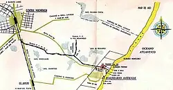 In 1913 a group of Belgian entrepreneurs inaugurated Ostende, a village in the coast built on a land they had bought to the Guerrero family. To go to Ostende, passengers went by train to Juancho, then being transported by horse-drawn carriages to "Colonia Tokio" where they took a narrow-gauge railway (Decauville) to Ostende.[5] On economic grounds, the coming of the train helped the zone to increase its production. Apart from cattle, producers commercialised apples and firewood, for which some small branches were built. One of those branches reached the point where the intersection of RP 11 and RP 74 is placed today, very close to the entrance to Pinamar. Nevertheless, most of those branches would be lifted in the 1940s.[1]