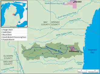 The Pinconning River (Ojibwe Opinikaaning-ziibi (syncope as Pinkaaning-ziibi), "River at potatoing-grounds")[3] is a small river on the central Lower Peninsula of Michigan in the United States. It is 15.6 miles (25.1 km) long[4] and flows to Saginaw Bay of Lake Huron, draining an area of 26.6 square miles (69 km2).[5] Via Lake Huron and the Great Lakes system, it is part of the larger watershed of the St. Lawrence River.
