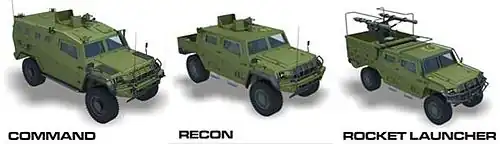 Its design features are made similar to the Renault Sherpa Light Scout family, which is also used by Indonesia.[4][5][6] The Komodo's external designs also resembles the Humvee.[7]