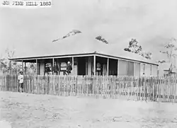 The Central Western railway line reached Pine Hill in 1883, with the Pinehill railway station at 23°39′01″S 146°57′23″E / 23.6503°S 146.9565°E its terminus.[7] The station buildings were completed in July 1883.[8] According to the Queensland Railways Department, the railway station was so named because the surrounding ridges were once covered in cypress pine.[9]