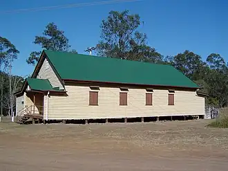 The Congregational Church commenced services at Pine Mountain circa 1863.[9] In May 1873 a Congregational Chapel was erected on a 3.5-acre (1.4 ha) site with a chapel that was relocated from Bremer Mills (at Bundamba).[10] This chapel was used to house a provisional school under teacher Mr Bryce with an enrolment of 50 to 60 children and an average attendance of about 30 children.[11]