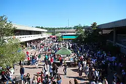 Pinecrest High School has an outdoor/indoor design, with students having to traverse between outdoor classes, and some classrooms that are inside of hallways. Most buildings are two floors, except the 9th Grade Building, and the learning cottages. The courtyard is in the center of the school, and is where most students eat their lunch. Most of the buildings have direct access to the courtyard, excluding the gym, weight room, auditorium, the 9th grade building, and the learning cottages. There are benches and picnic tables in the courtyard.