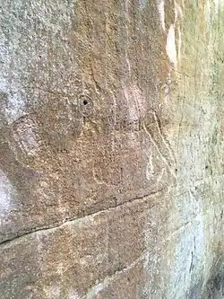 The Piney Creek South Site is a prehistoric rock art site located on the south side of Piney Creek in Piney Creek Ravine State Natural Area in Randolph County, Illinois. The site consists of two groups of petroglyphs drawn on a sandstone rockshelter. The petroglyphs most likely date from the Late Woodland period, which lasted from 450 to 900 A.D. The larger petroglyph group contains ten designs: four anthropomorphs, a quadruped resembling a deer, three crosses, and two pits. The four designs in the smaller group include two anthropomorphs, a group of pits extending from an anthropomorph's head, and a pecked area. Several of the anthropomorphs appear to have wings, two are carrying shields or rattles, one appears to have a beak, and one may have a crude penis. The site likely had spiritual significance, and the anthropomorphs may represent shamans, who were frequently depicted with wings in Native American art.[2]
