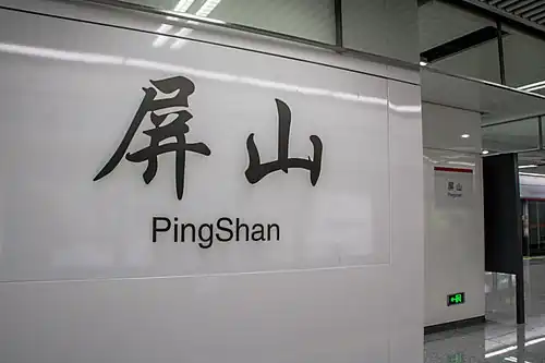 Pingshan Station (Chinese: 屏山站; pinyin: Píngshān zhàn; Fuzhounese: [piŋ˥˥ laŋ˥˥]) is a metro station of Line 1 of the Fuzhou Metro. It is located on the intersection of Guping Road, Qiantang Lane and Yeshan Road in Gulou District, Fuzhou, Fujian, China. It started operation on January 6, 2017.[1][2]