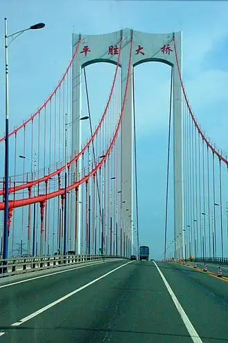 The Pingsheng Bridge (Chinese: 平胜大桥; pinyin: Píngsheng Dàqiáo) is single tower, single span self-anchored suspension bridge located in Foshan, Guangdong Province, China. Opened in 2006, the bridge has a main span of 350 metres (1,148 ft).