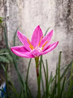 Pink rain lily, pink fairy lily, pink zephyr lily, and pink magic lily are the common names of several species of flowering plants belonging to the genera Zephyranthes and Habranthus (rain lilies):