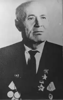 By decree of the Presidium of the Supreme Soviet on 19 March 1944 for his courage and heroism in crossing the Dnieper River captain he was awarded the title Hero of the Soviet Union and the Order of Lenin. His name is recorded at the Ukrainian Museum of the Great Patriotic War.[1]