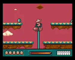 Pinkie can jump over enemies to stun them temporarily when outside of his pod vehicle, but can only take one hit before losing a life.[2][4][5] When using the Pinkie Pod, the player is invulnerable and perform various actions such as elevate to reach higher platforms, attack enemies, dive underwater, and store collected eggs.[2][3][4][5] Between levels, the player can obtain upgrades for the Pinkie Pod to augment its features.[2][4][5] After completing each level on a planet, a boss must be fought to progress further.[1][4][5]