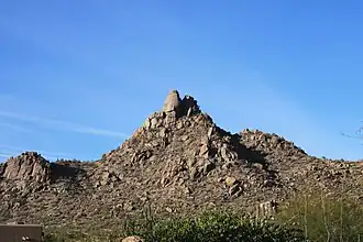 Pinnacle Peak is a granite summit located in Scottsdale, Arizona.[3] The peak rises to an elevation of 3,169 feet (966 m). It is located within the 150-acre (61 ha) Pinnacle Peak Park,[4] operated by the City of Scottsdale Park District. Part of the Sonoran Desert, the park is home to a variety of native desert flora and fauna.[5] Hikers utilize a 1.75 mile trail to explore the area,[6] though rock climbing skills are needed to reach the summit.[5]