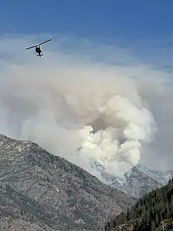 On June 8, 2024, a 10-to-15-acre (4.0 to 6.1 ha) fire was reported on private land near Pioneer Creek about 31 miles (50 km) northwest of Chelan in the eastern foothills of the Cascade Mountains.[1][3] The cause is undetermined and remains under investigation, but is suspected to have originated from a human-caused structure fire.[3][4] By the following day, the fire had reached 600 acres (240 ha) in size and prompted evacuations for recreational areas near Lake Chelan. Several hikers were rescued from the Lakeshore Trail via marine transport by the Chelan County Sheriff. Pacific Northwest Team 13 was assigned to fight the fire after it had expanded into the nearby Okanogan–Wenatchee National Forest.[3][5]