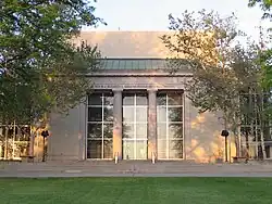 Pioneer Theatre Company performs at the Roy W. and Elizabeth E. Simmons Pioneer Memorial Theatre, located on the west side of the University of Utah campus in Salt Lake City, Utah.[7] Construction of the theatre building started with a groundbreaking on July 1, 1960, and its architecture was designed to be reminiscent of the historic Salt Lake Theatre once located in the city's downtown.[8] The completed building was opened and dedicated on October 10, 1962, with a production of Hamlet.[9][10]