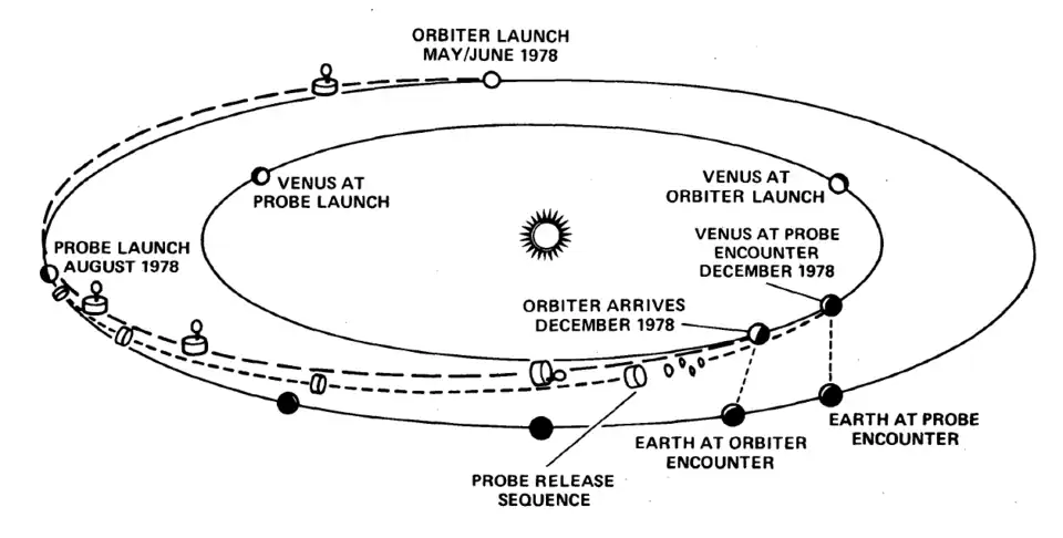 Diagram of the PVM's path to planet Venus from Earth in 1978, and this also notes the launch of the Pioneer Venus Orbiter which took place that year also.